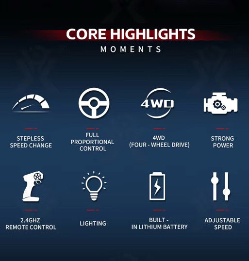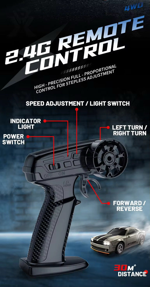 Equipped with a 4WD drive system, it has strong power and can achieve high-speed driving and professional drift action on various terrains
